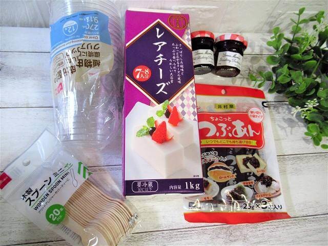今回はブルーベリージャム・いちごジャム・つぶあんとトッピングなしのレアチーズのみで作ってみたいと思います。