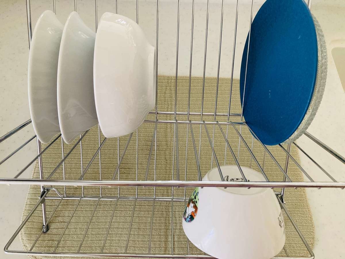 まずはお皿や茶碗を置いてみました。深さのある小鉢は幅の広い左側に、浅いお皿は幅が狭い右側に置いてあります。立てて置けるのでラック上がかさばらず、スッキリとしています。