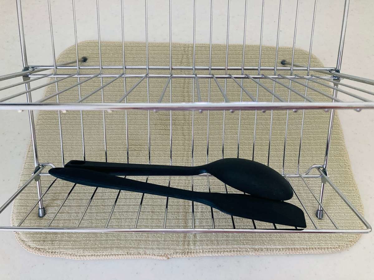 でもご安心あれ!おたまなどのキッチンツールは置けます。上段と下段に分かれているので上段にお皿を、下段にコップやキッチンツールと分けて水切りできました。