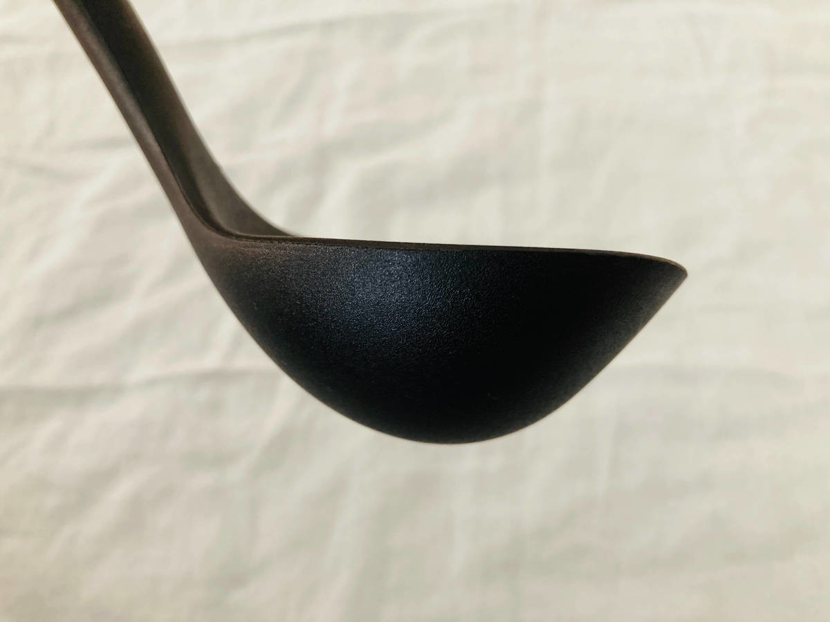 おたまは深さがあり、横から見ると直線的な形になっています。通常なら横から見たおたまの形は半円に近いですが、この形がいい仕事をしてくれるんです♪