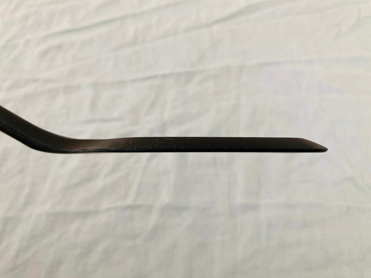 ターナーを横から見てみると底が平らになっています。さらに先が細くなっているので、食材とフライパンの間にも入りやすいです。
