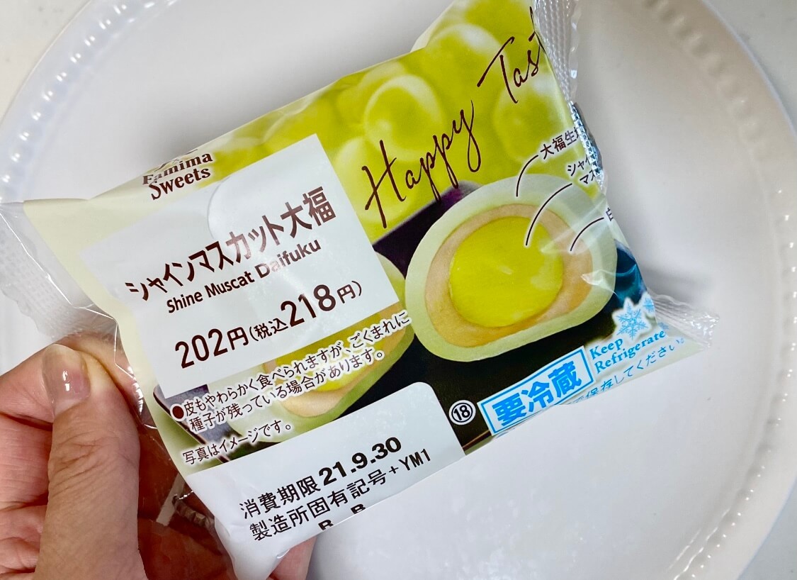 洋菓子派の私もついゲットしたこちらの「シャインマスカット大福(218円 税込)」は、贅沢にシャインマスカットを一粒包んだスイーツ大福♡