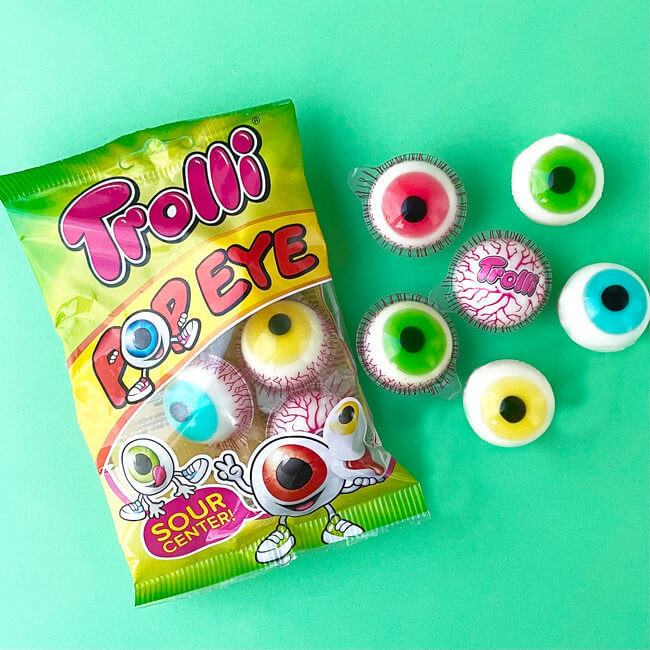 貰った瞬間「ゾワッ」とする、ちょっと不気味な目玉グミ。血走った目が描かれたケースの中にはレモン(緑)、ラズベリー(青)、ペアー(黄)、レッドフルーツ(赤)味のグミは入っています。