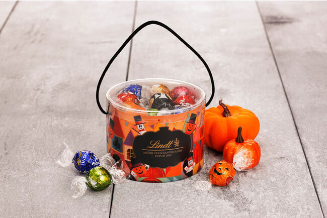 「トリック オア トリート」&「ハッピー ハロウィン」にピッタリなバケツ型のラウンドボックスにリンドールがぎっしりと詰められています。