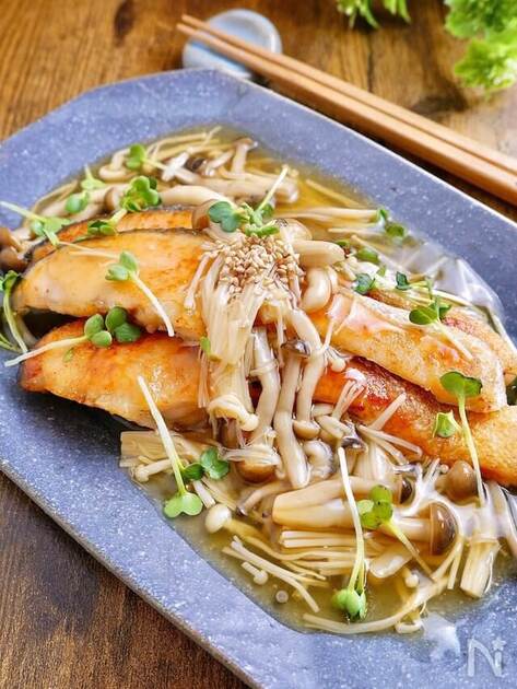 秋鮭ときのこを美味しく味わい尽くせる秋らしさ満点の一品。和風きのこあんを先に作り、こんがり焼いた鮭にとろりとかければ出来上がり。お好みで、かいわれ菜を散らしていただきます。