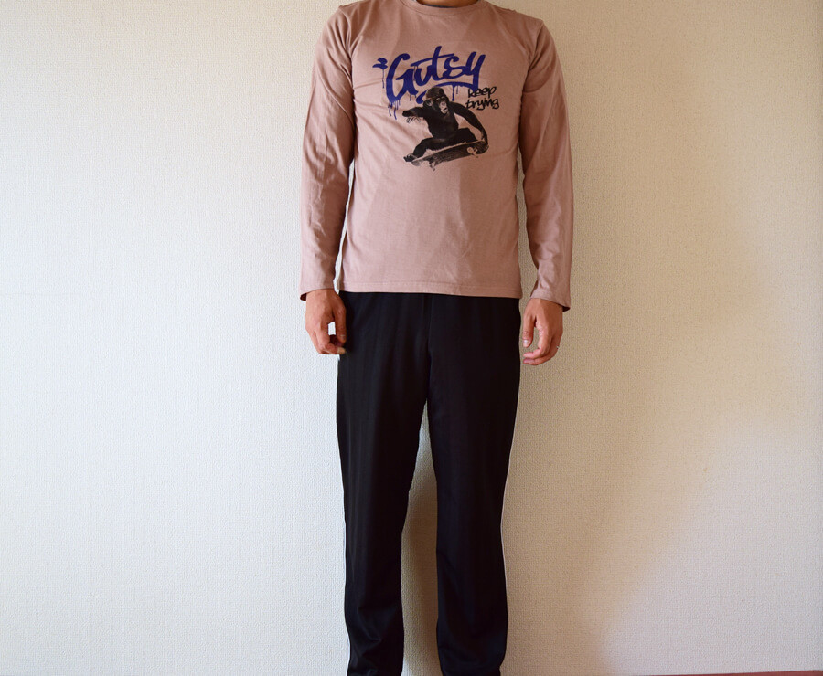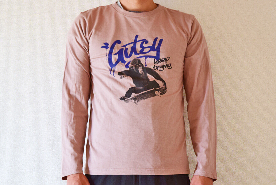 なぞのチンパンジーがスケートボードを楽しんでいる長袖Tシャツ。個人的にはオシャレな感じはしませんが、ファッションに1ミリも興味がない夫は色合いだけ見て決めたようです。