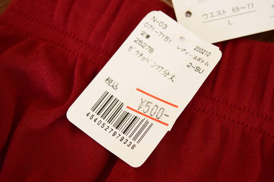 衣類が安いトライアル。タイミングによっては、さらにお安くなっていることも。「ガウチョパンツ7分丈」がワンコインで売ってました。ガウチョパンツが紅葉のような色合いで、秋にはぴったりですね。