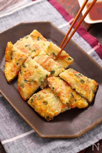 香ばしい風味ともちもちの食感がやみつきになる、ヘルシーお焼きのレシピ。絹ごし豆腐がメインの生地にカニカマと青ねぎを混ぜて、旨みたっぷりに仕上げます。お好みで、ポン酢や麺つゆをつけてどうぞ。