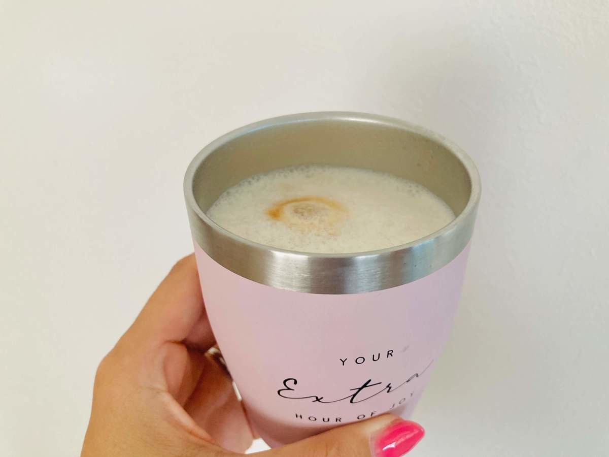 熱~いカフェラテを入れてみました。二重構造のおかげで手が熱くなりません♪マグカップや紙コップは直接持つと熱くてかないませんが、これなら長い間手で持っていられますね。