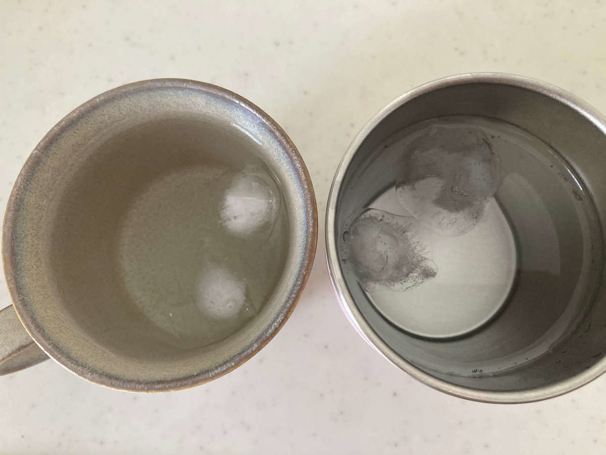 氷はマグカップの方が若干溶けるのが早かったです。ただし溶けきるまでの時間に大きな差がありませんでした。