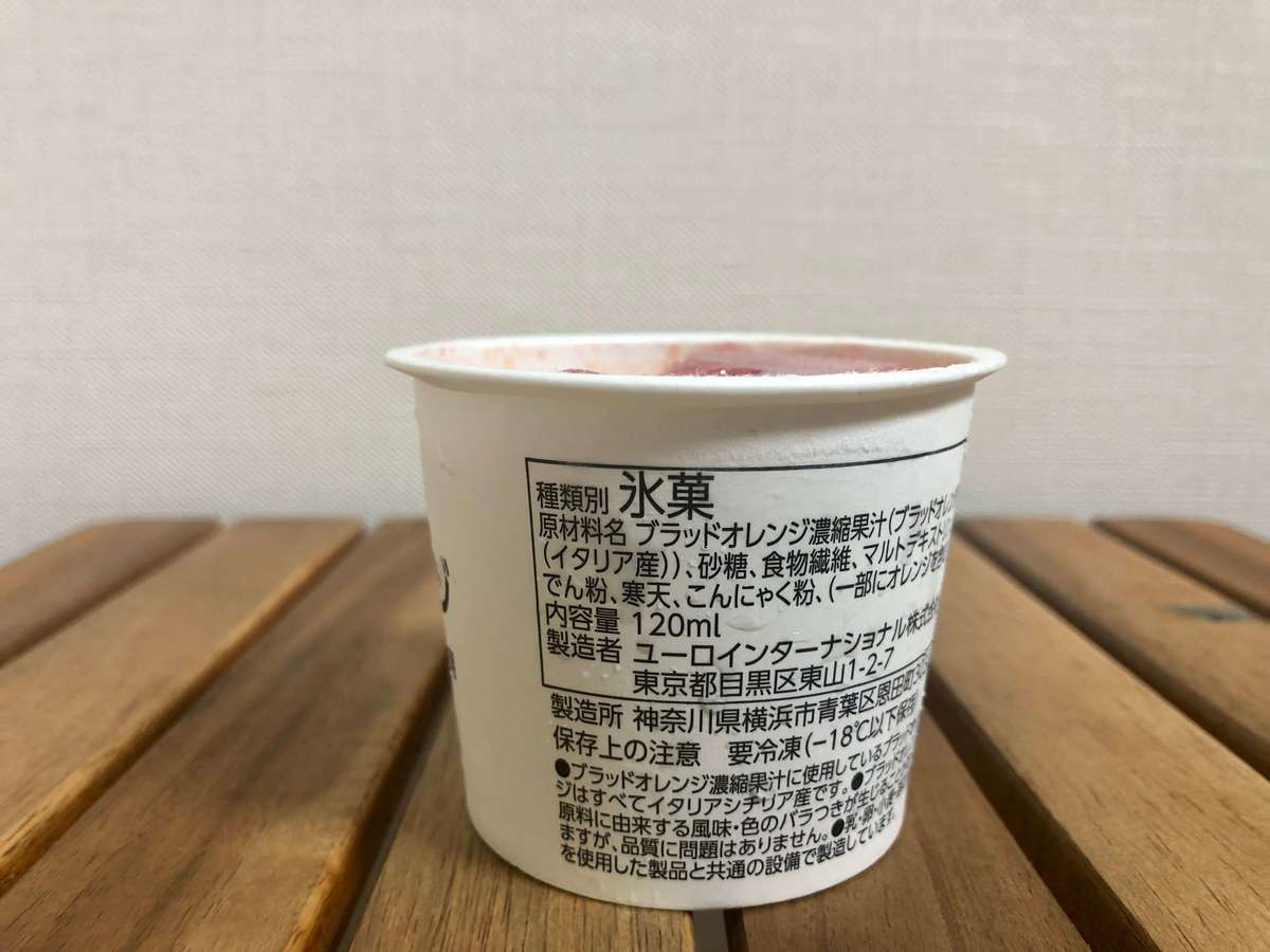 イタリア産ブラッドオレンジを使用していて、味は、かなり容赦なく酸っぱいブラッドオレンジです。 ブラッドオレンジジュースをそのまま固めたような味でした。