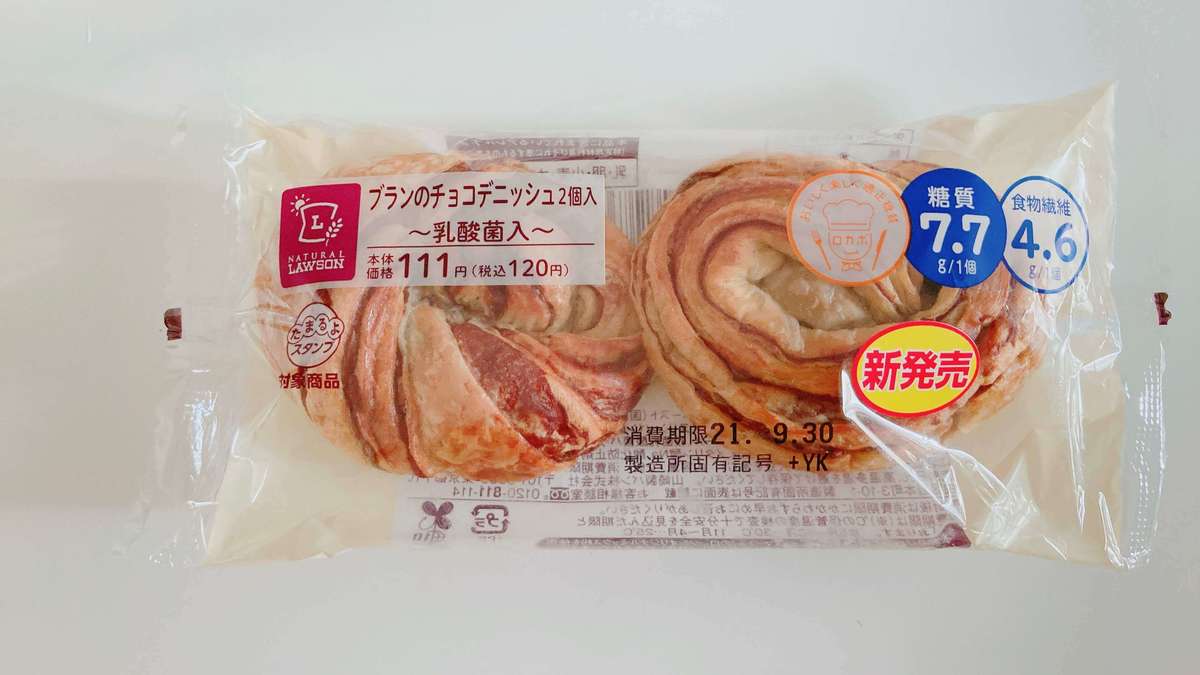 こちらはローソンの低糖質パンシリーズで新しく発売された「ブランのチョコデニッシュ2個入り」(税込120円)。まず食べやすいサイズが2個入っている点がGOODですよね。