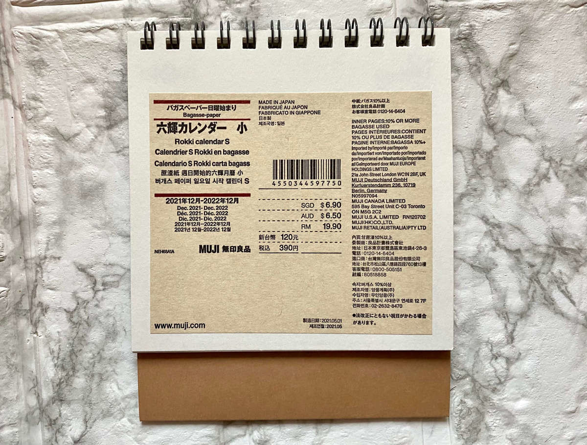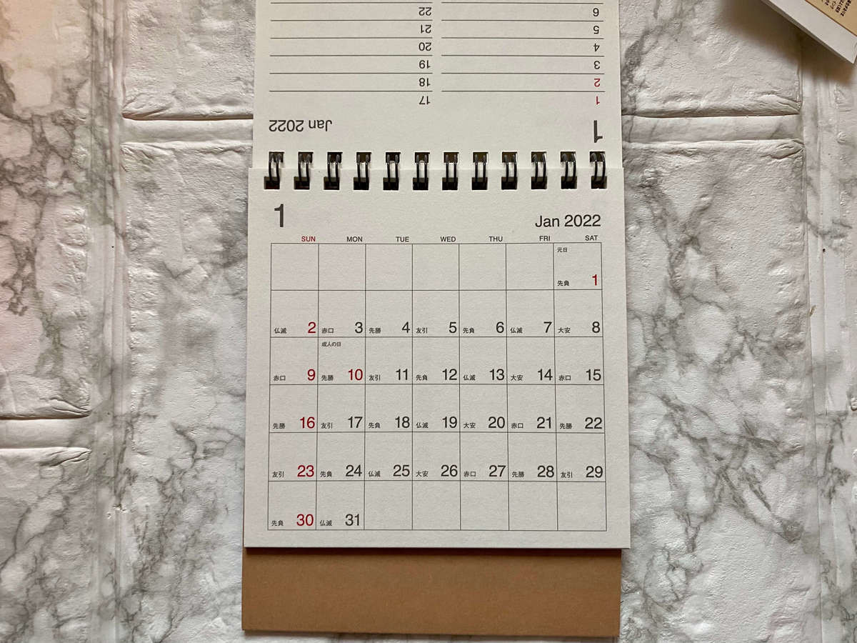 こちらは、筆者が毎年購入している「バガスペーパー日曜始まり六輝カレンダー」。
