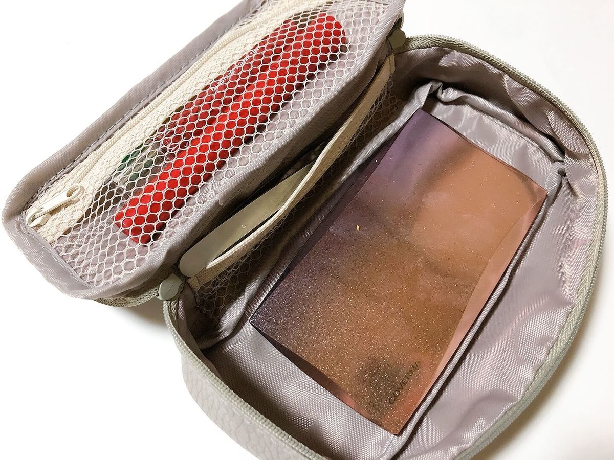 コンパクトのファンデーションも余裕で収まります。最低限必要なメイク道具は、このポーチだけで十分。ダブルファスナーなので開けやすく、中の作りもしっかりしていますよ♡