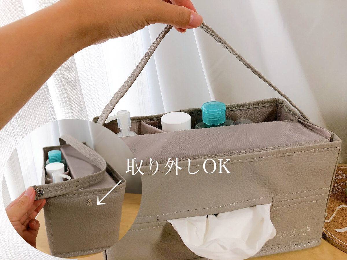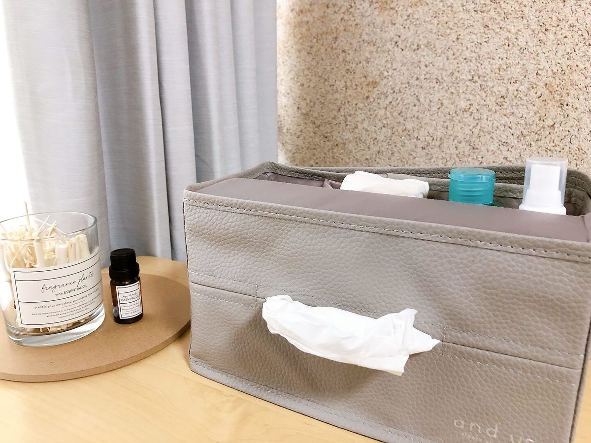 こちらは、ボックスティッシュと化粧ボトルなどが、一つにまとめて収納することができます。プラスチックや木など硬い素材ではなく、合成皮革なので柔らかくて高見え効果バツグン!