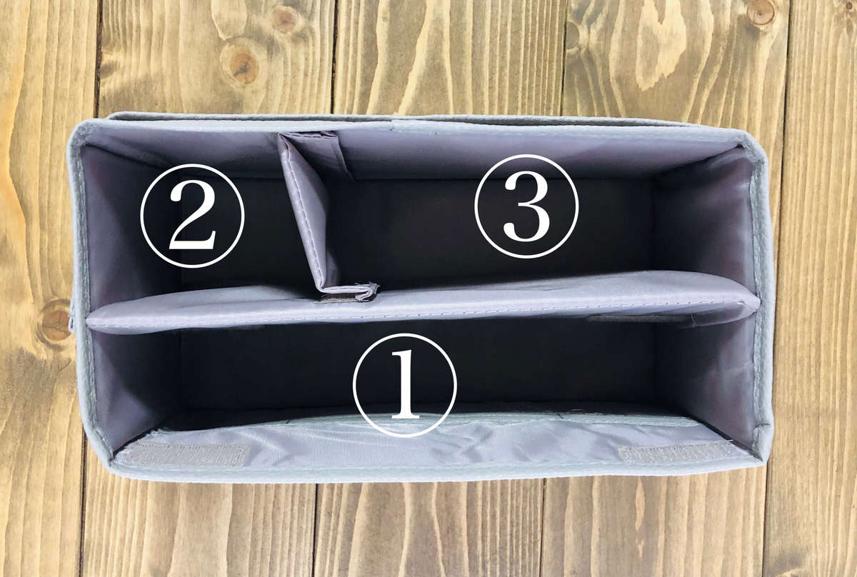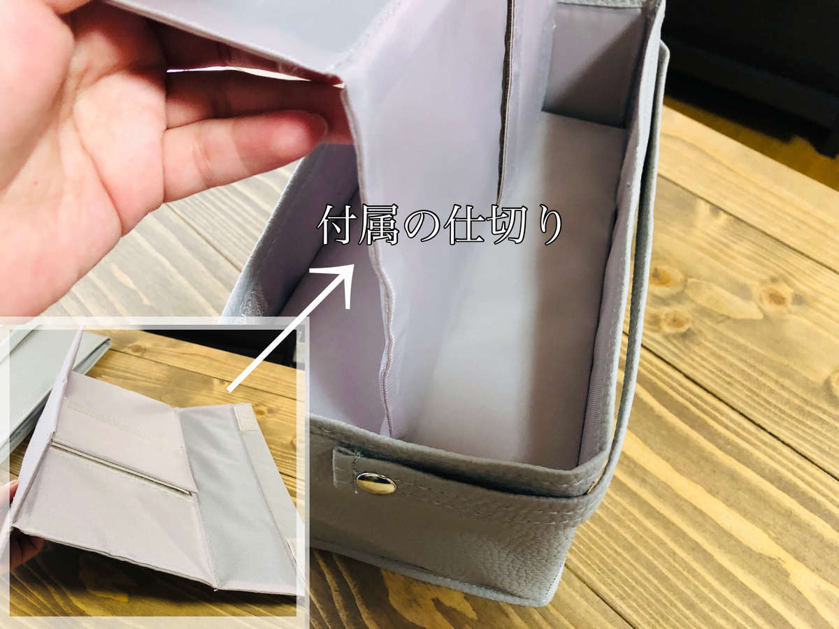 組み立てる時は、本体を広げて中に仕切り板を入れるだけで完成です!中にマジックテープが付いていますので、向きは合わせてくださいね。