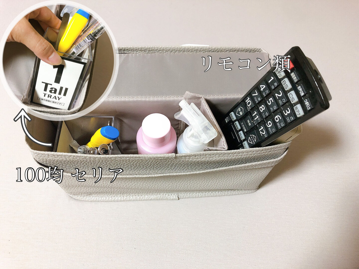 ちなみに、中の仕切りにはセリアで購入した透明のケースがピッタリフィット!ボールペンや印鑑など無くしてしまいそうなものの収納としても便利です。