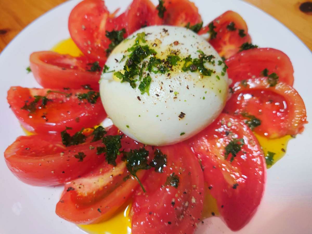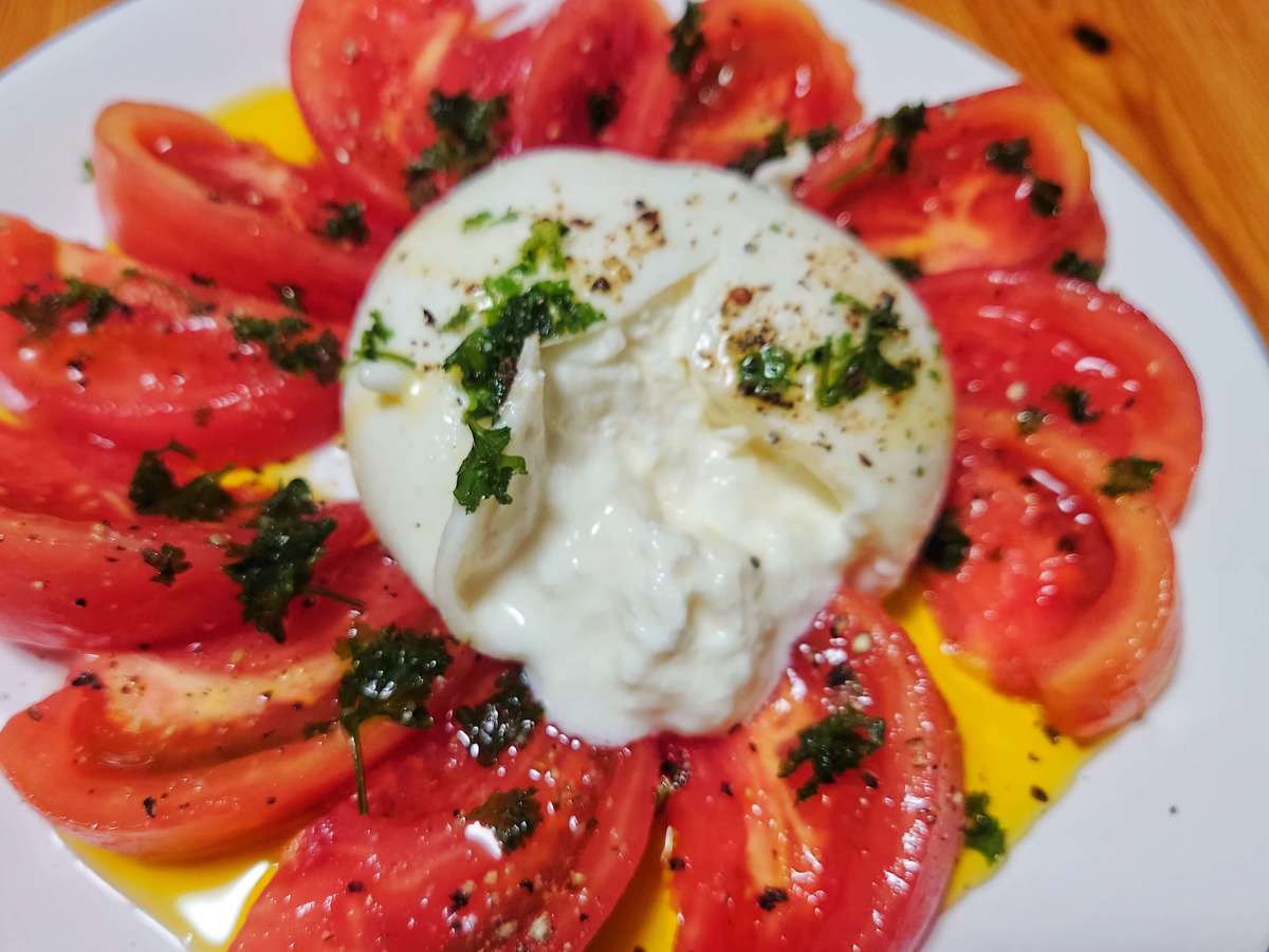 カットしたトマトを並べ、真ん中にブッラータを置き、パセリをチラして、オリーブオイルと塩・胡椒をかけて完成です。