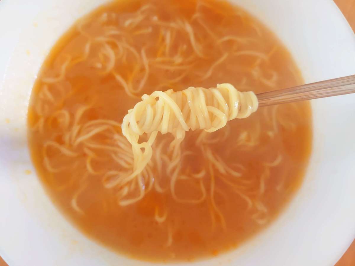 実際に食べると、細麺がツルツルと口当たりよく、噛むとコシがあります。