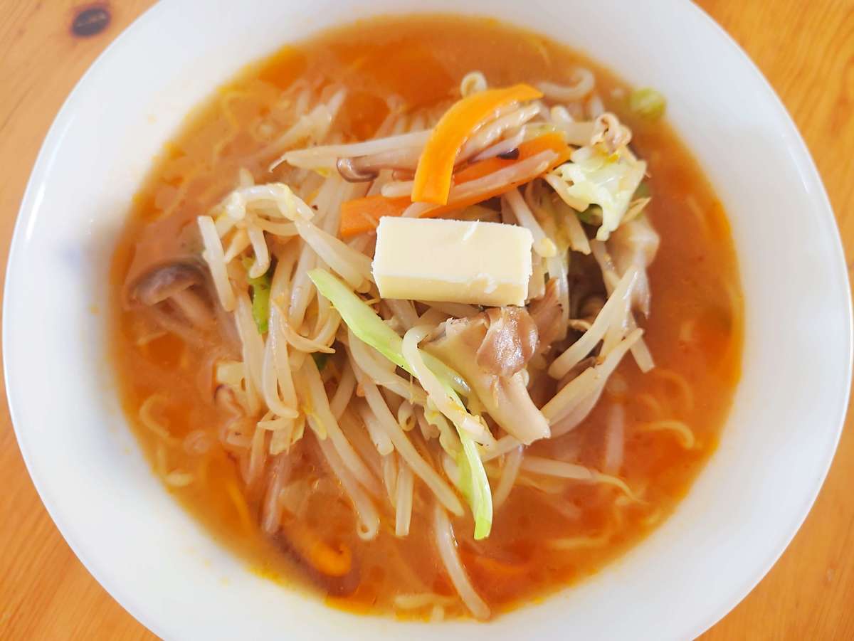 野菜炒めをラーメンに乗せて、仕上げにバターを乗せるだけ。