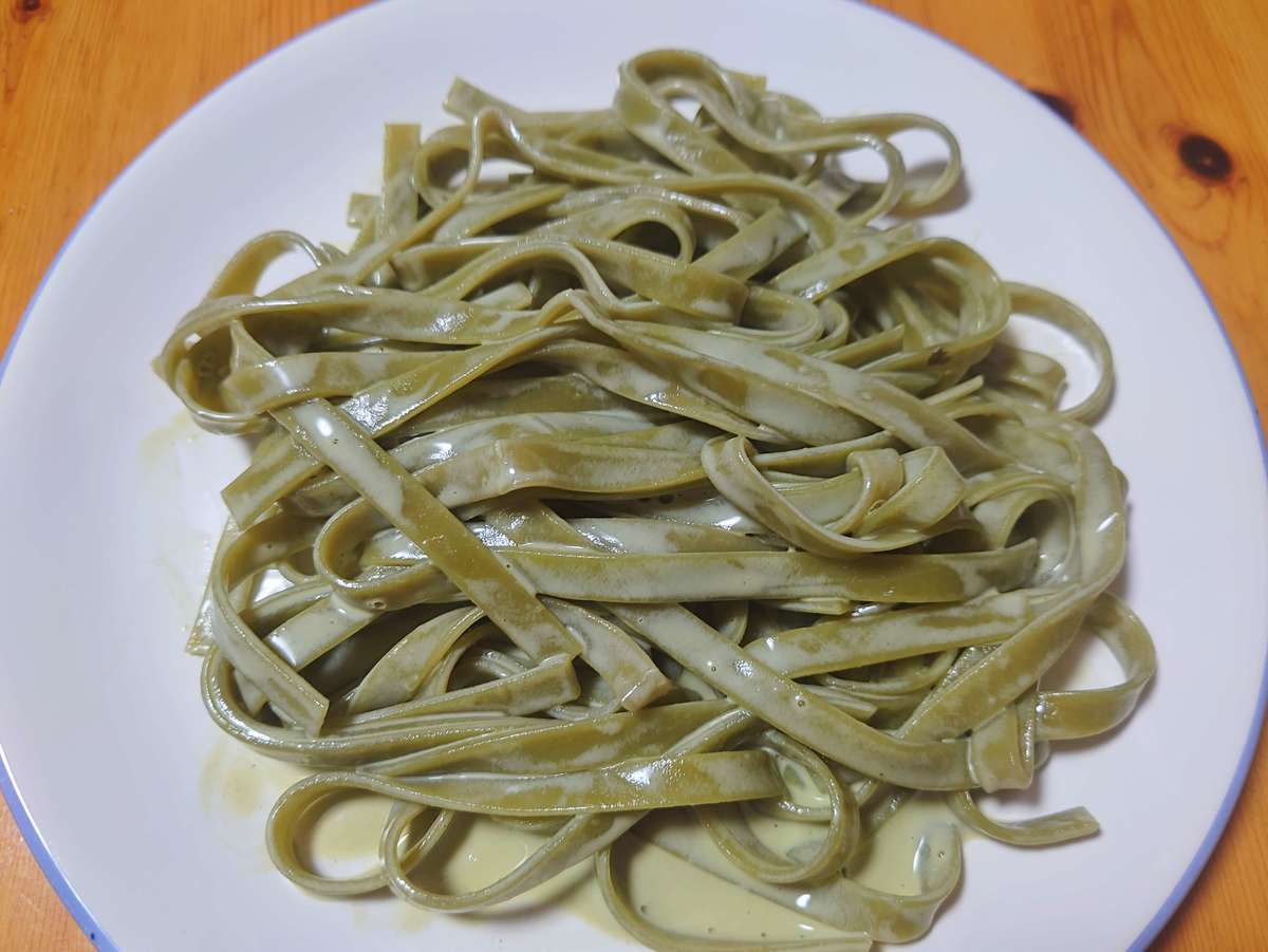 ほうれん草パウダーが練り込まれている、きれいな緑色がかったパスタです。
