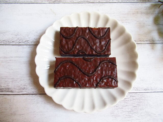 「やさしい甘さのカカオケーキ」では横7㎝×厚さ2センチ弱と、若干やさしい甘さのカカオケーキのほうが小さめ……。