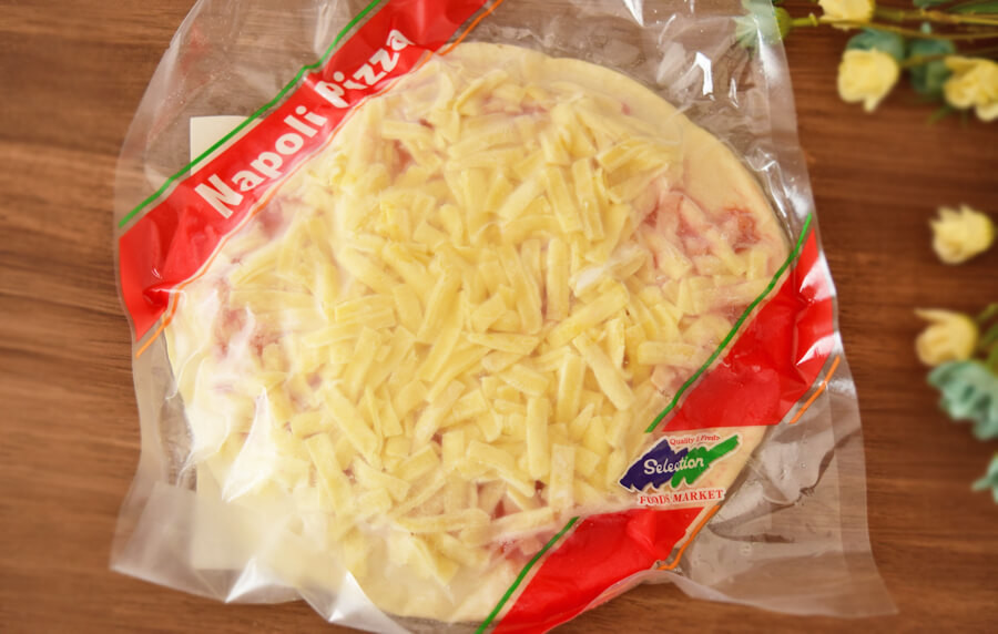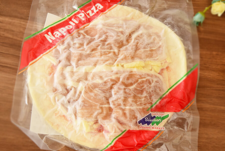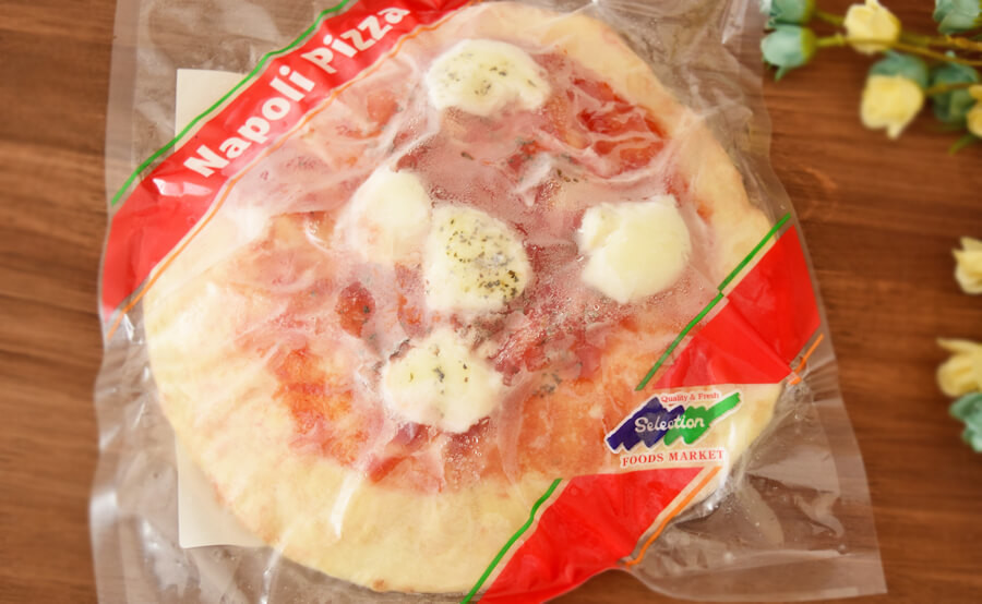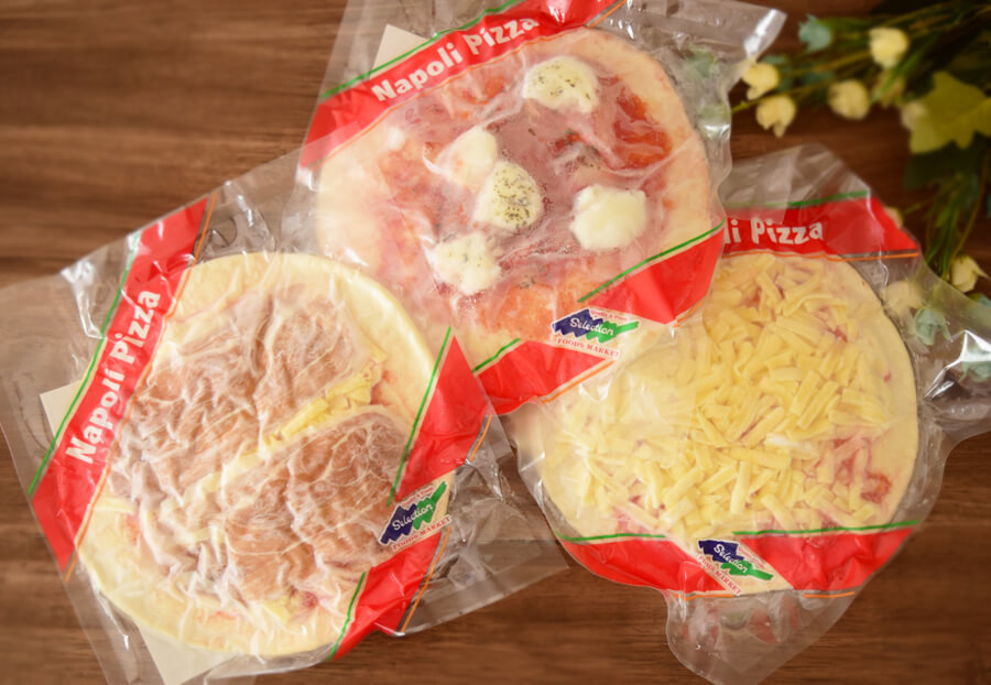 セレクションの冷凍ピザはワンコイン以下。個人的には具材よりも、ピザ生地のもっちもちでふちがカリカリしていて、おいしいと感じました。