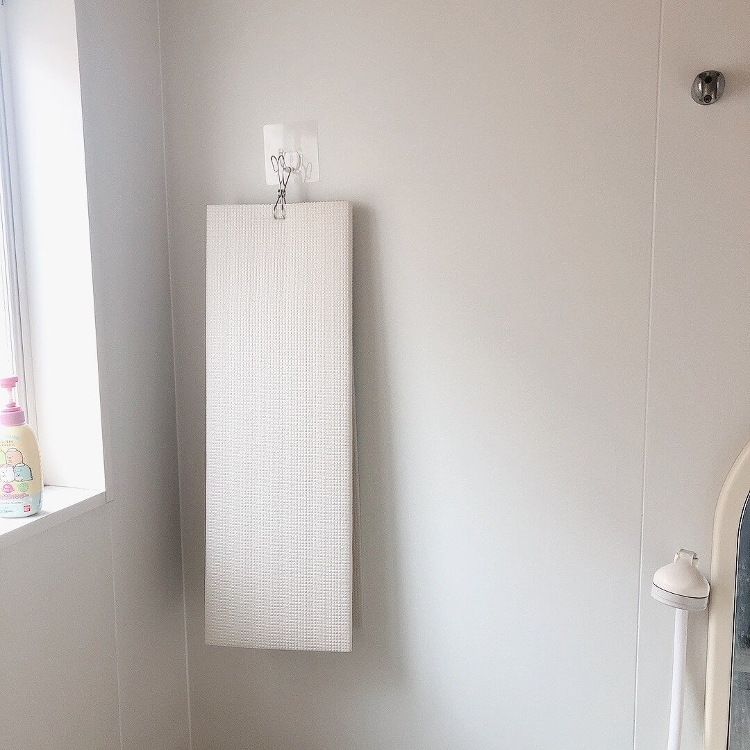 シールバスフックは使用前に、貼り付ける場所の汚れを引き取ってから貼りつけると剥がれにくくなります。