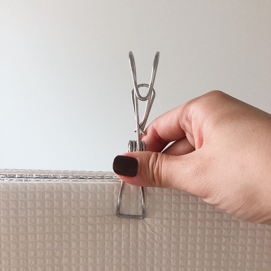適当な位置に貼り付け、ステンレスフックで保温シートを挟んで、フックに引っ掛ければ完成です!