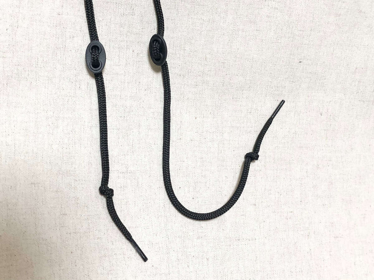 アジャスターになっているため、紐の長さは自由自在に変えられます。ただしマックスまでしぼると、紐が長すぎてしまうのが玉にキズです。