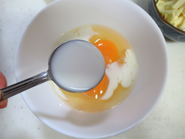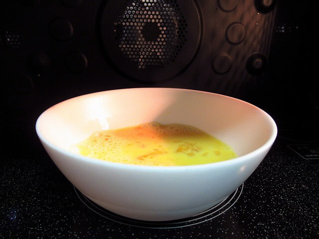 ①耐熱容器に卵・牛乳・塩少々を入れ、かき混ぜる
