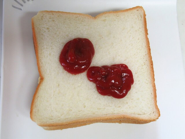 ⑤もう1枚の食パンを上から被せ、その上にケチャップ大さじ2を塗る