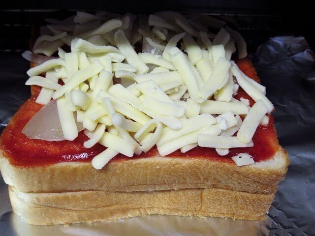 ⑥オニオンスライスと、とろけるミックスチーズを乗せ、オーブントースターで5分加熱したら完成
