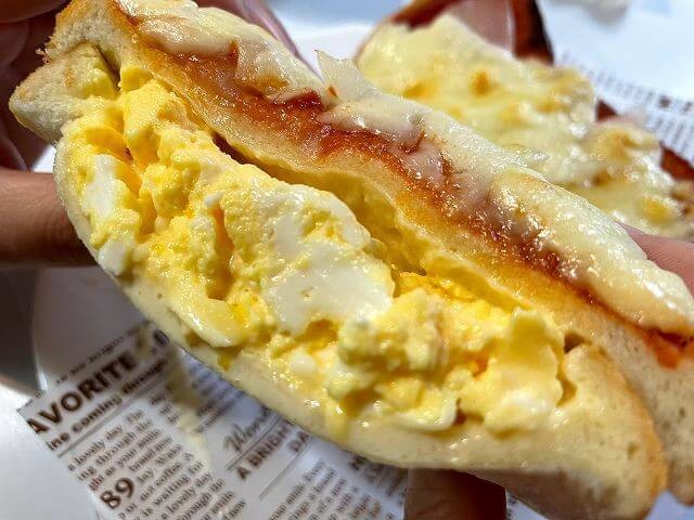 食パンを2枚重ねた分厚いトーストは、半分にカットしたほうが食べやすいと思います。