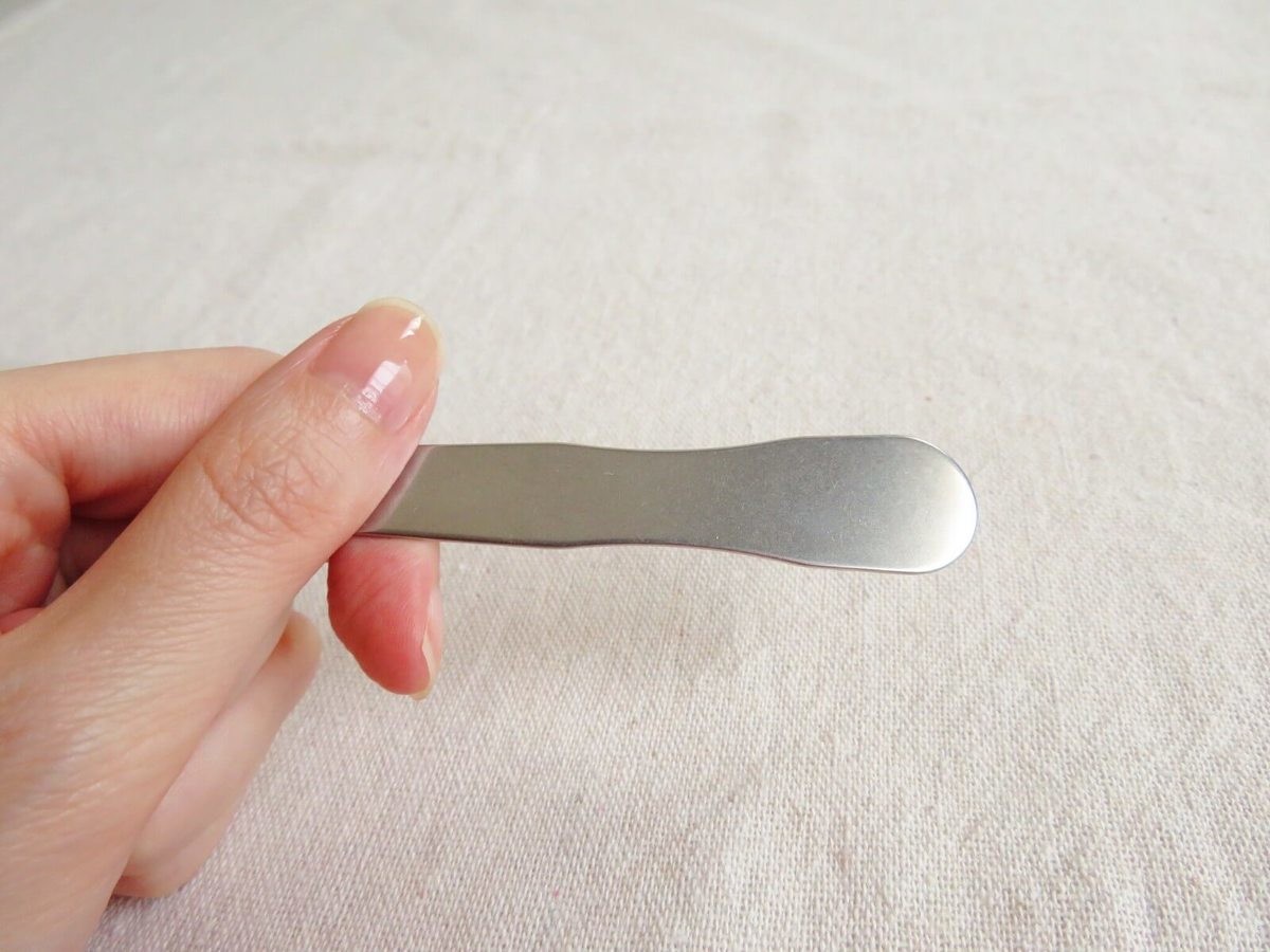 薄く真っ直ぐな形で「さじ」がありません。「すくう」というより「のせる」「けずる」感覚で使います。