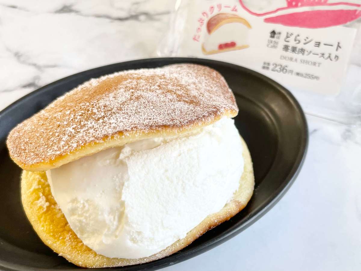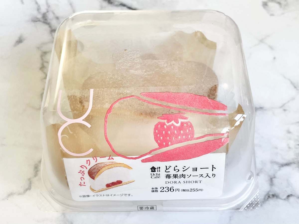 ローソンで購入できる「どらショート 苺果肉ソース入り」をご紹介しました。