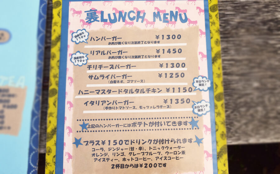 - ハンバーガー+サラダorポテト+ドリンクで1250円(税込)