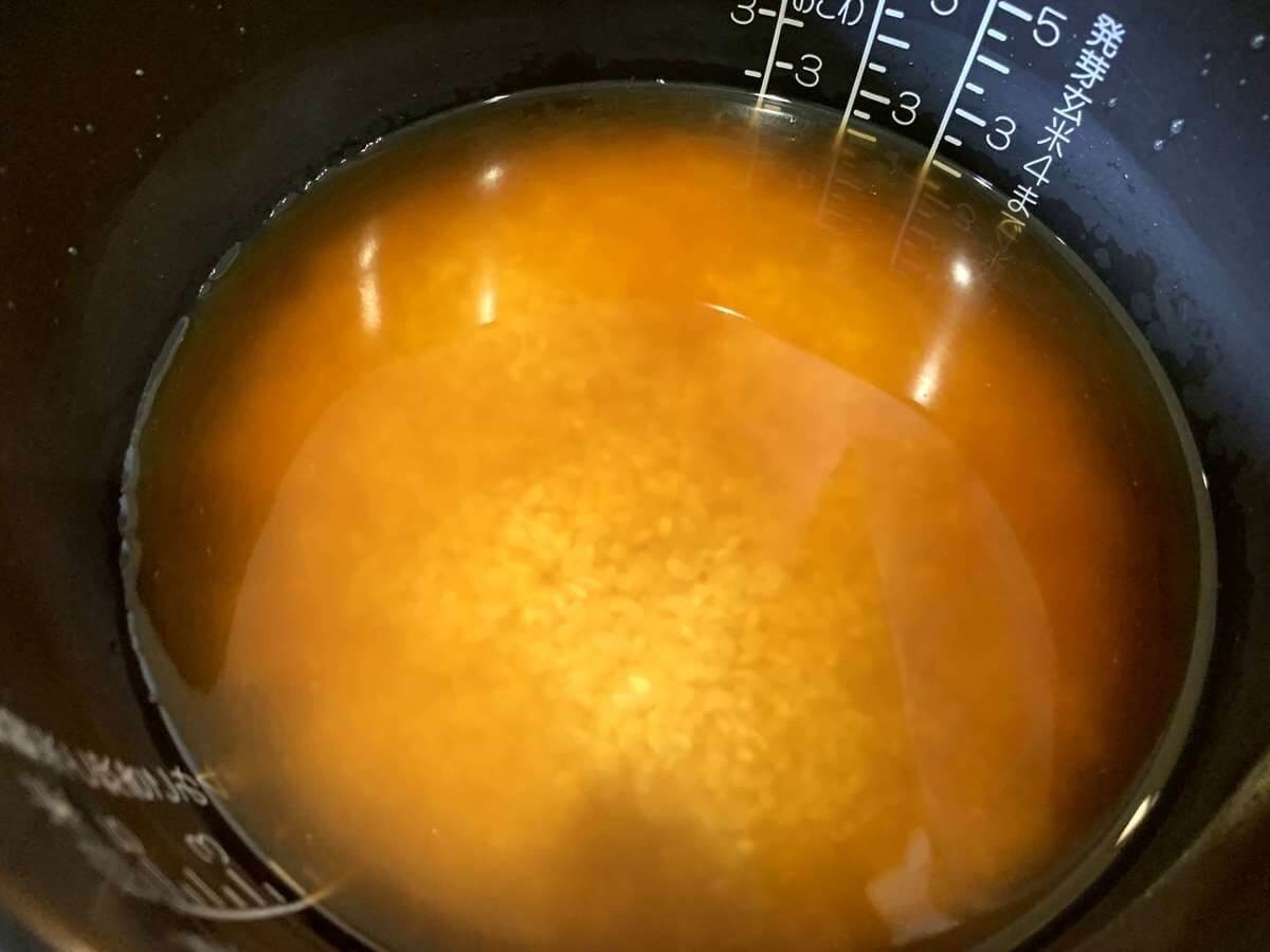 お米(2合)を研いで炊飯器に入れ、水を規定の目盛りまで入れます。