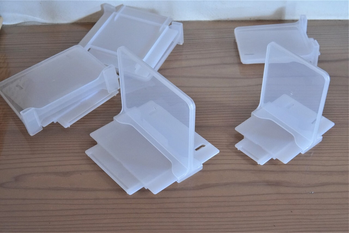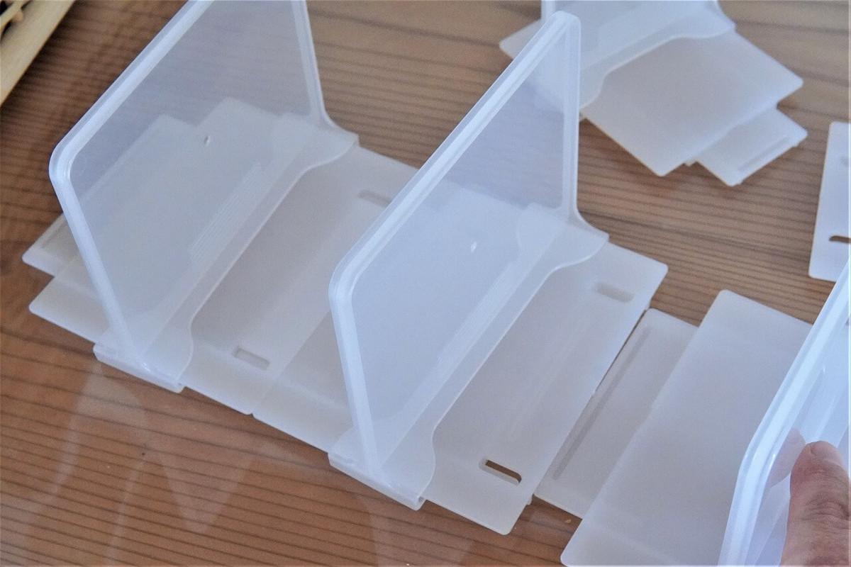 収納ケースの中の分類分けと倒れてしまうのを防げる、便利なスタンド式の仕切りを見つけました。