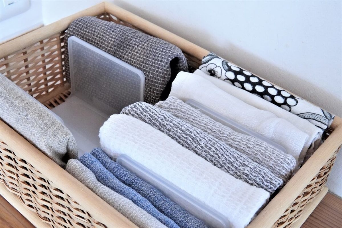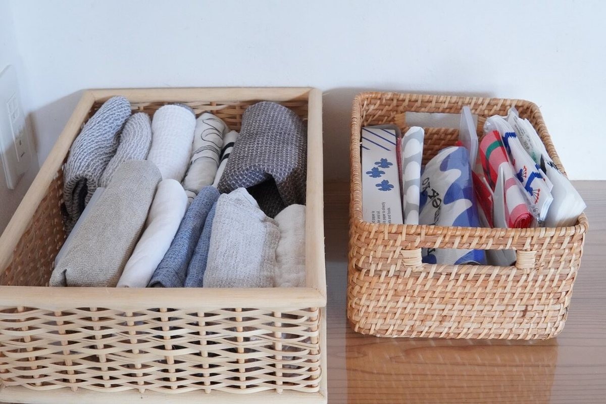 キッチンで収納ケースにまとめて入れる収納をしていることが多い、キッチンタオル類。