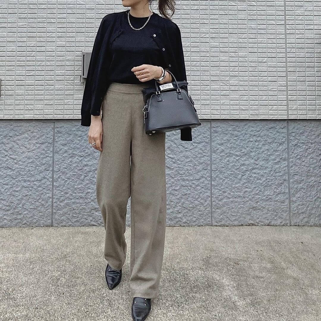 ベージュのセットアップは、黒小物で引き締めると今っぽく仕上がります。