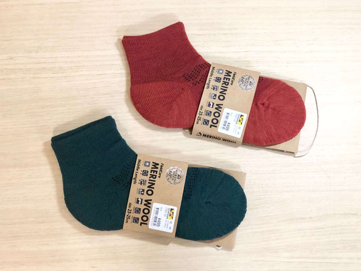 写真のようなほっこりした色味の靴下は、去年は「ローゲージソックス」で展開されていました。私は、このローゲージソックスの色味が大好きなので、メリノウールでも似たカラーが登場したことに、テンションがあがり即買いしちゃいましたよね。
