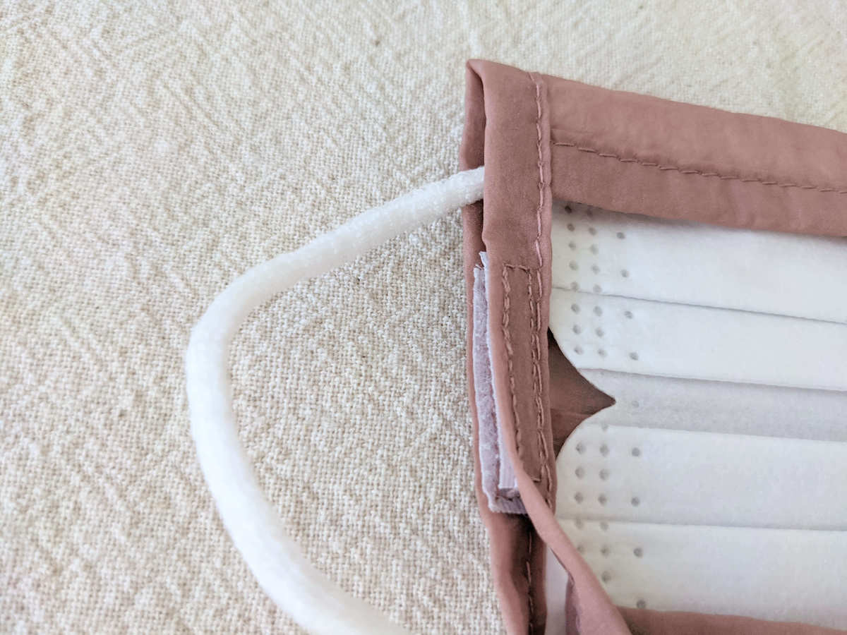 不織布マスクをカバーにセットしたら、このように両サイドのマジックテープでズレないように固定します。