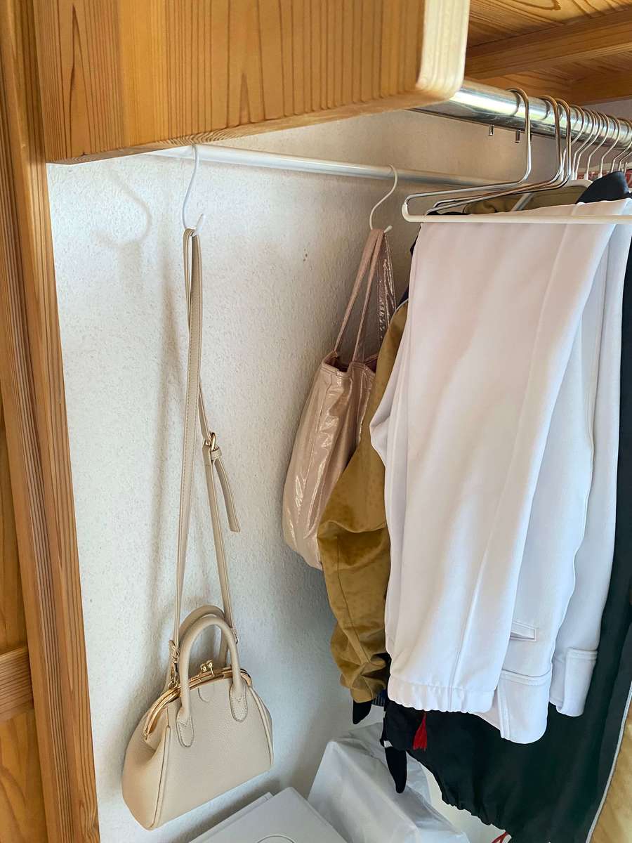 S字フックとのセット使いで、空いてる壁際の空間を有効利用できて、収納スペースを増やすことが出来ました。