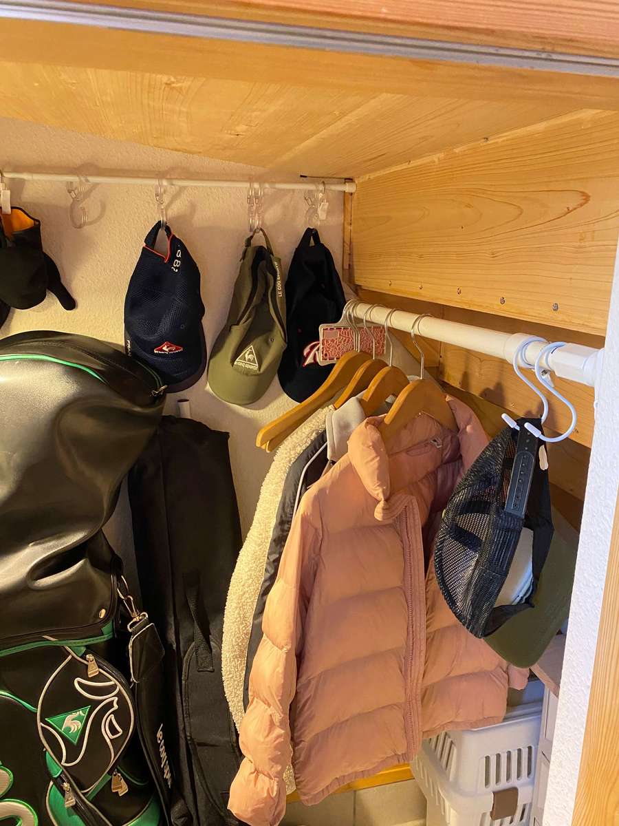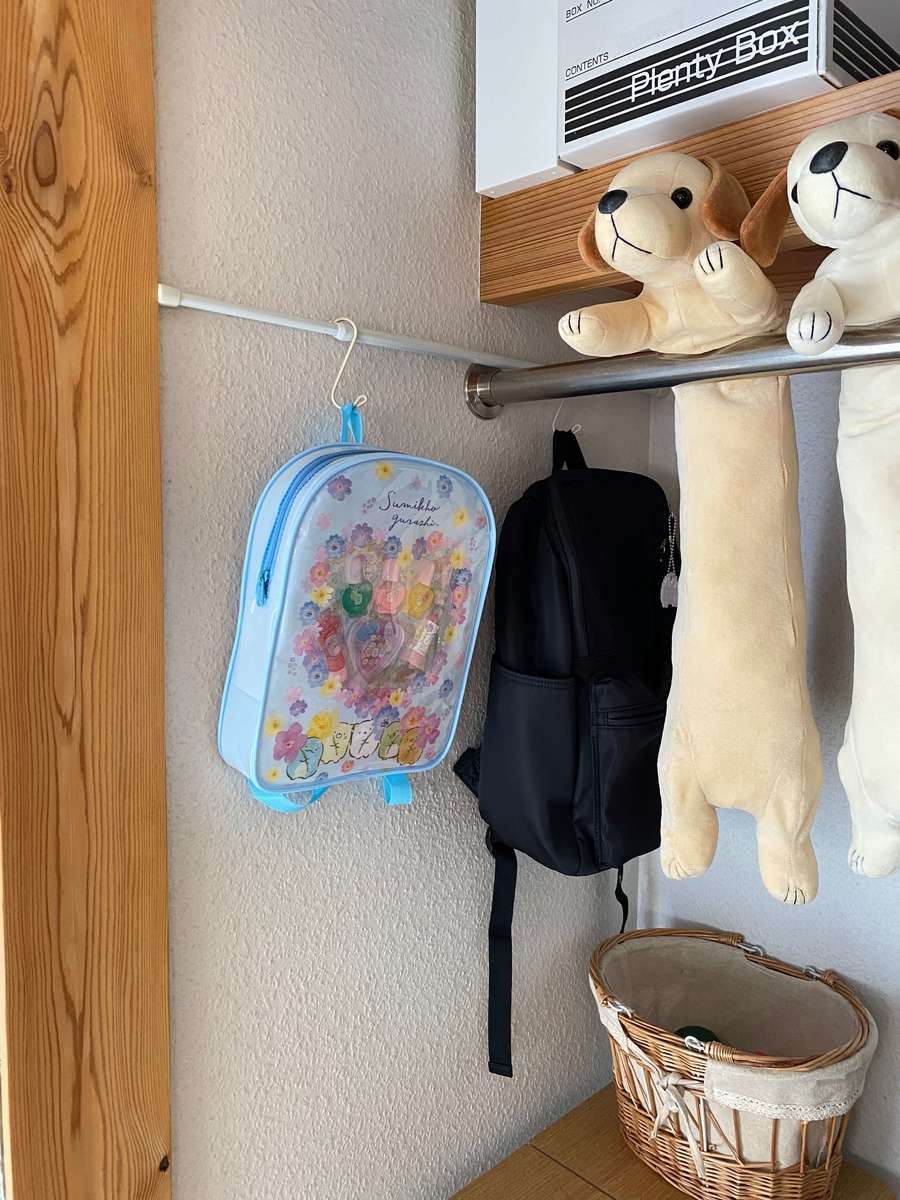 既存のポールだけだと収納として使うには足りなかった我が家は、ポールの後ろにも突っ張り棒を設置して、軽いものを中心に引っ掛け収納できる場所を作りました。