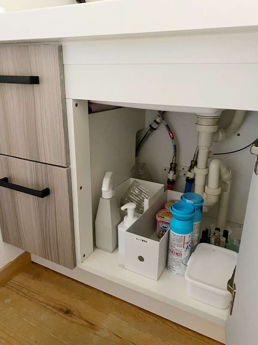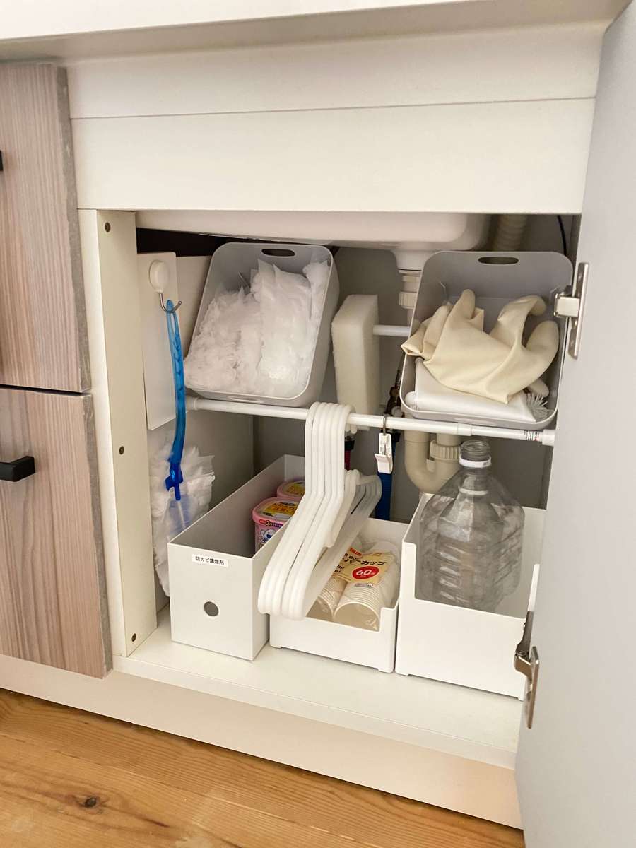 上部の空間があくのが気になり、収納ケースやコの字ラックなどで仕切って収納していた時期もありましたが、後ろの配管が邪魔をして、なかなか上手く収納できていませんでした。