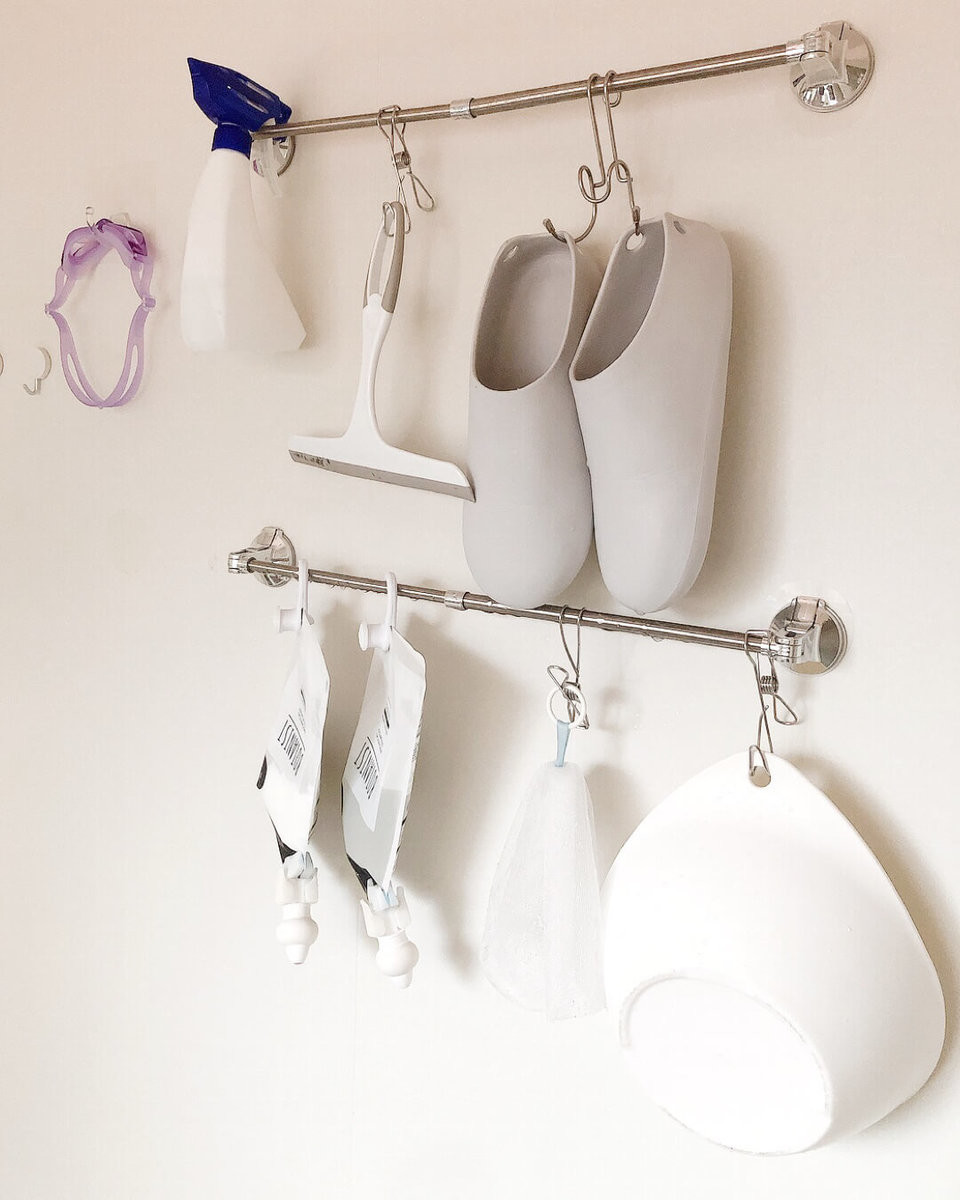 収納するさいは、吸盤のついたモップホルダーを使って浮かせています。現在、ニトリでは「強力ジェル吸盤 モップホルダー 508円(税込)」が売られていて、おすすめですよ。
