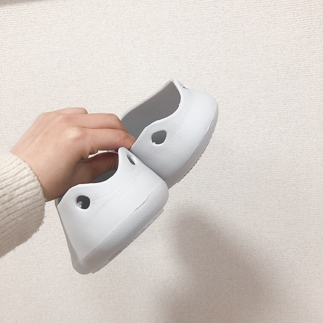 柔らかくて履きやすく、色もシンプルなグレーなので気に入っています。サイズは男女兼用の27cm。