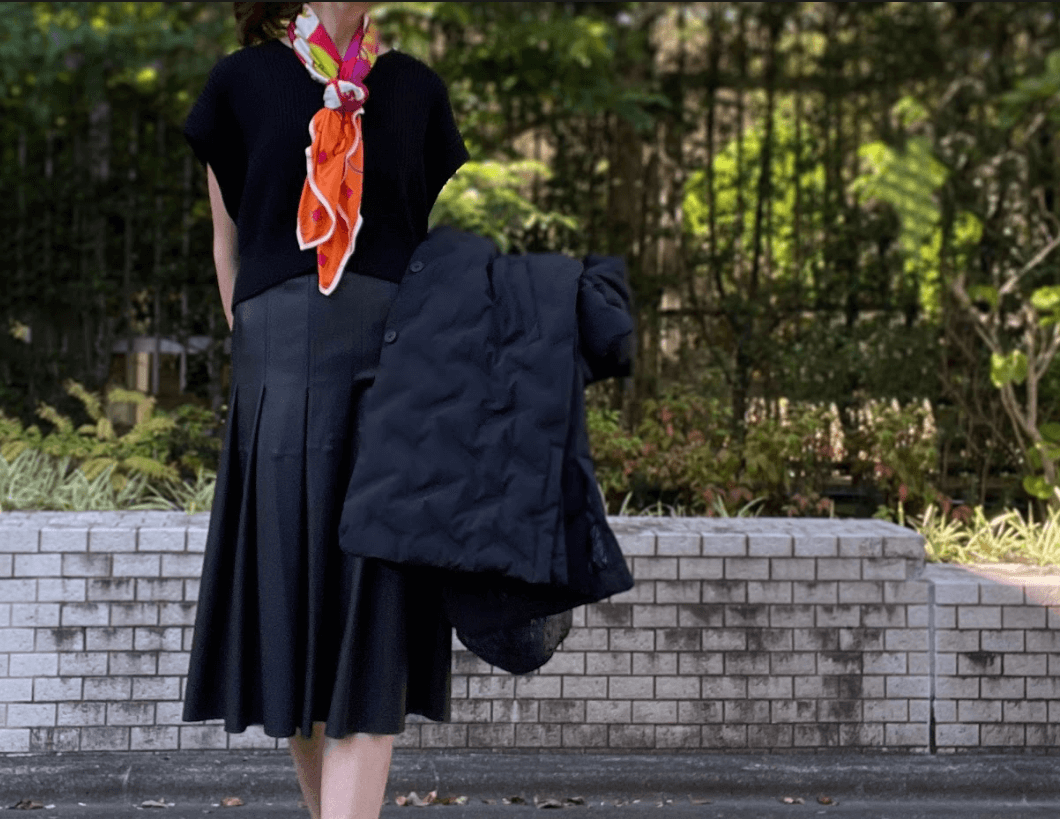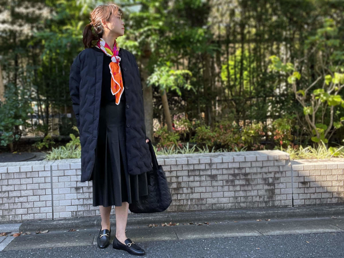 スカーフをアクセントにしたいので、お仕事トートも洋服の色に合わせたブラックで。