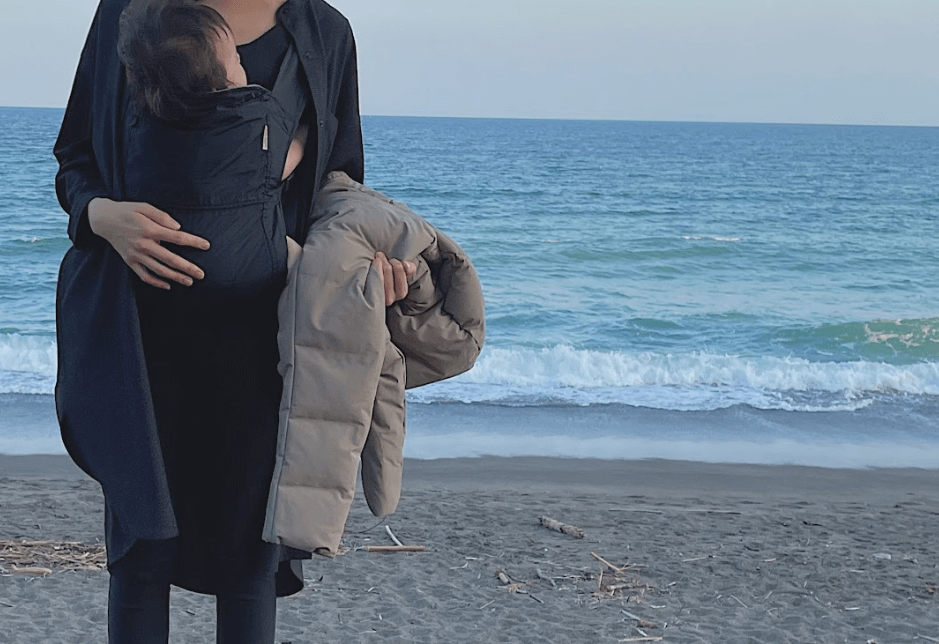 アウターのフロントを開けることが多い、子どもと一緒の移動。車や電車での移動中に娘があちこち触らないように、シャツワンピースを抱っこ紐の上から着用しました。前開きスタイルのとき、大きなフードで子どもを風から守れるのもうれしいです。
